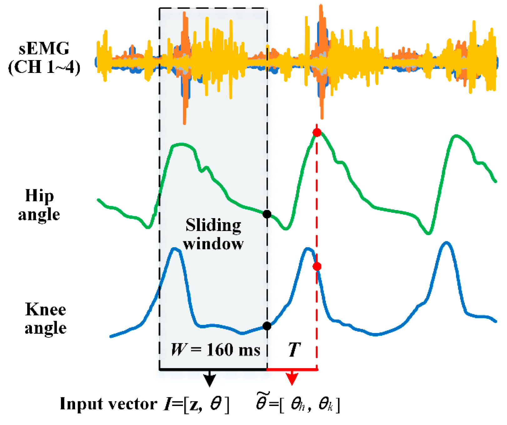 Figure 4. Data window scheme and data labeling. Input vectors are labeled by angles measured by the IMU-calculated joint angle and the four-channel sEMG instantaneous value. W denotes window length. T denotes prediction time. θ ~ denotes the labeled angle.
