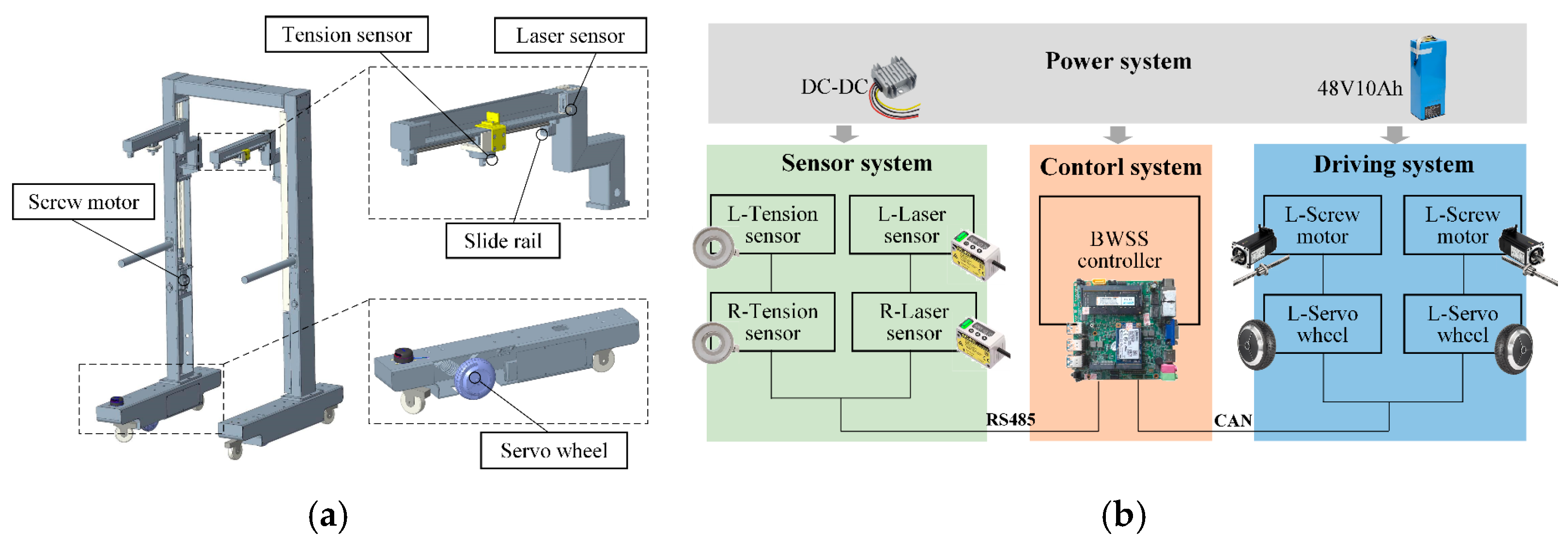 Figure 6. Composition of the proposed human-tracking BWSS. (a) Structural composition. (b) Block diagram of the developed system.