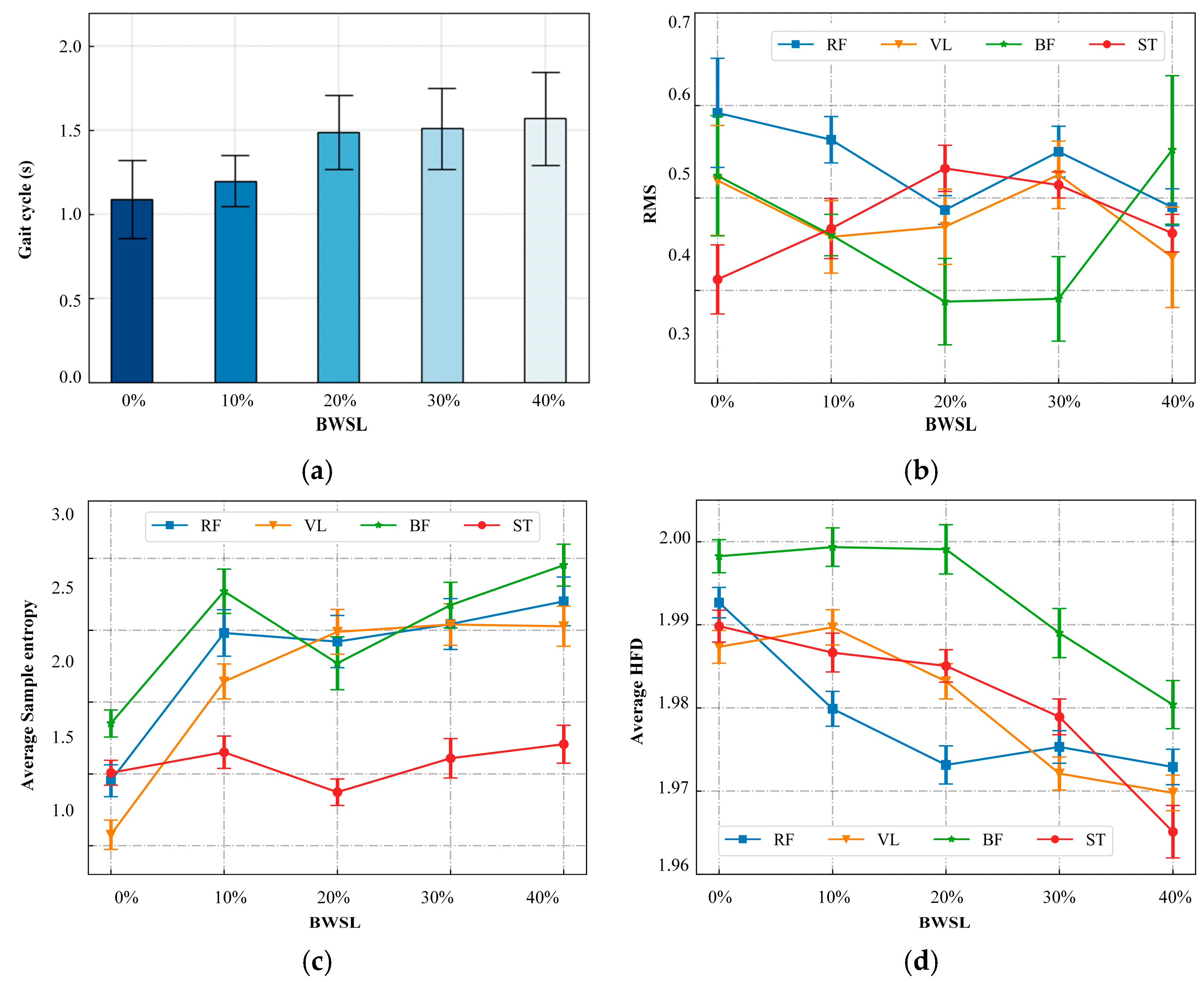 Figure 8. Influence on gait cycle and muscle activation features with BWSLs. (a) Gait cycle variation, (b) sEMG RMS variation, (c) variation in of SampEn, (d) variation in average HFD.