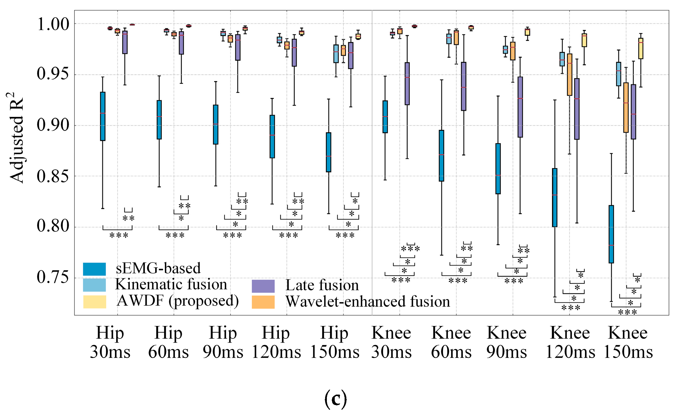 Figure 11. Results of model prediction with BWSLs for different models. (a) RMSE, (b) CC, (c) Adjusted R2. Statistically significant difference (*, p < 0.05. **, p < 0.01, ***, p < 0.001).