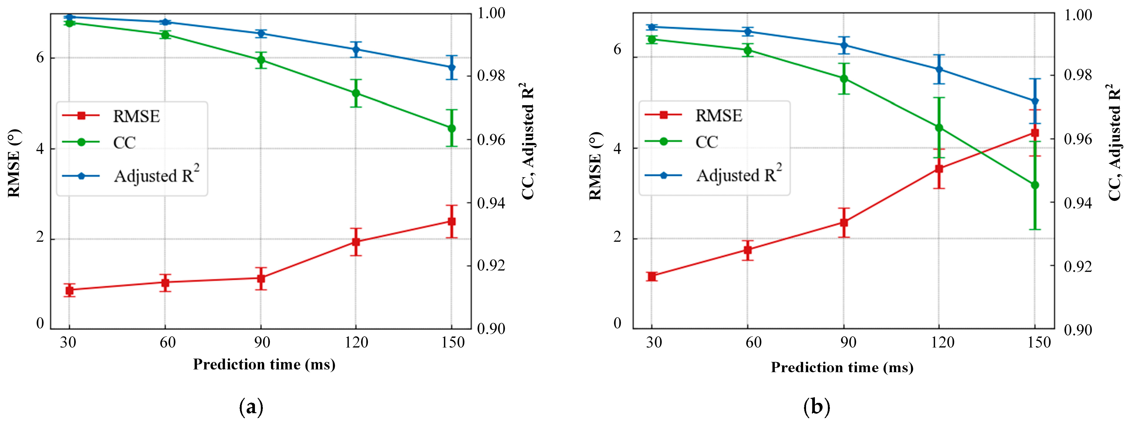 Figure 10. The prediction performance of AWDF model with increased prediction time. (a) Hip angle prediction. (b) Knee angle prediction.