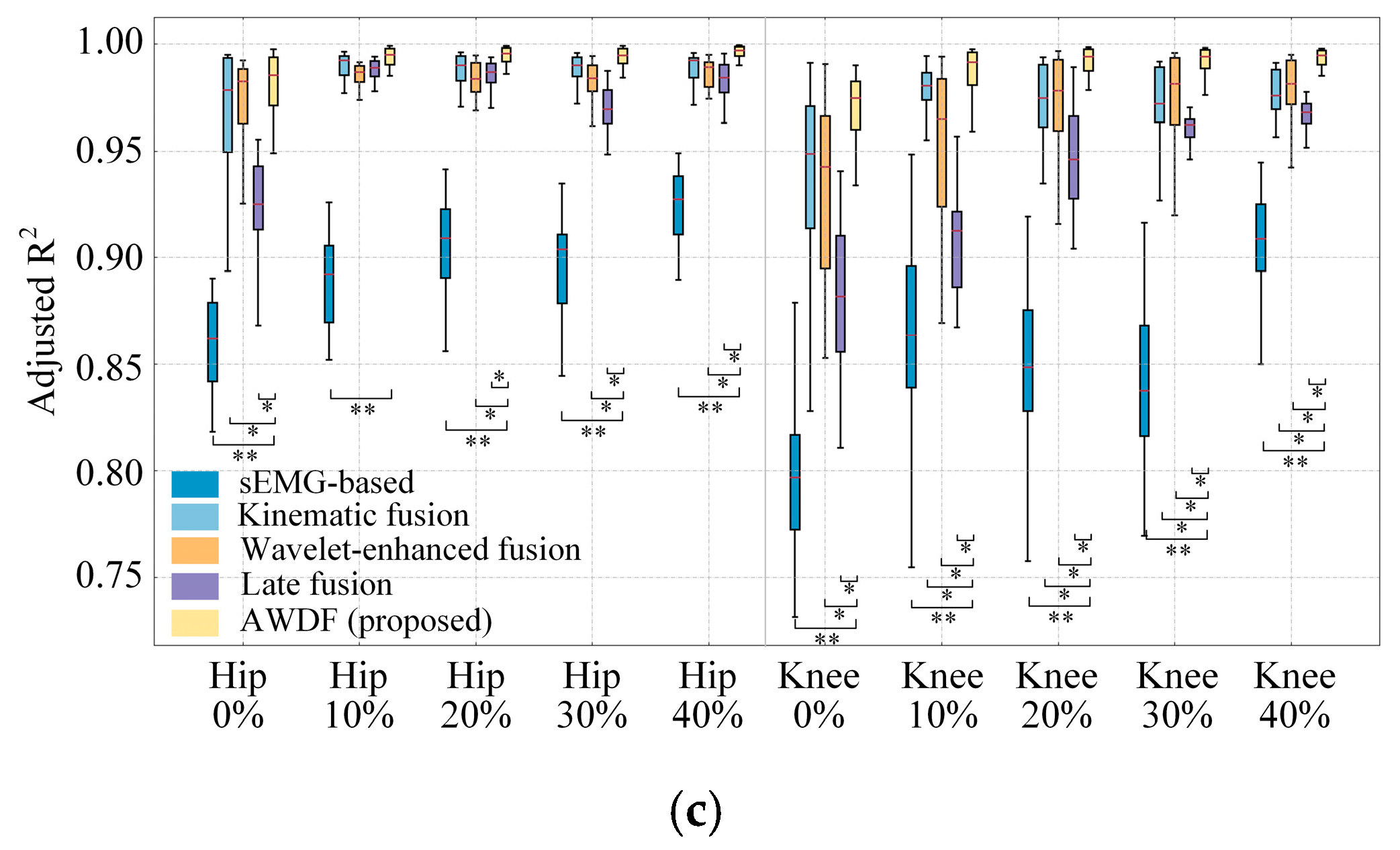 The proposed AWDF model employs an early fusion strategy, integrating denoised sEMG features, kinematic data, and BWSL parameters at the feature level before the final regression layers. An alternative paradigm is late fusion (or decision-level fusion), where predictions from multiple unimodal or simpler models are combined. To rigorously evaluate the superiority of our feature-level fusion approach, we implement late fusion models for comparative analysis [34,35].