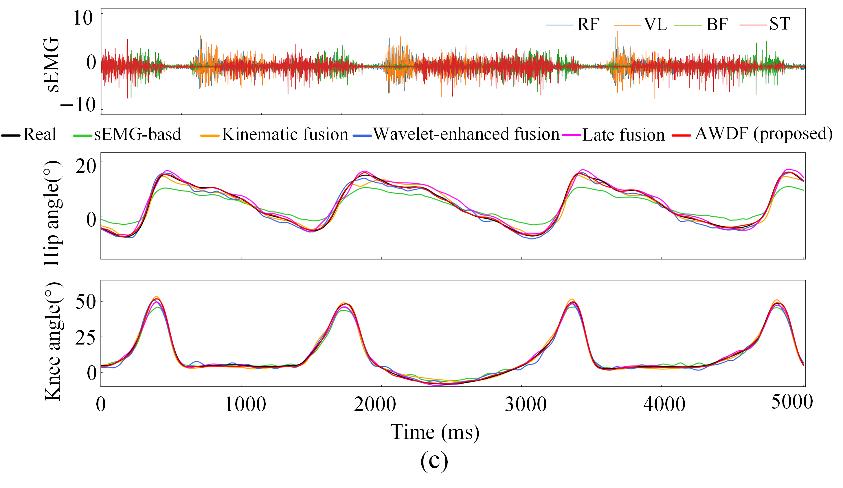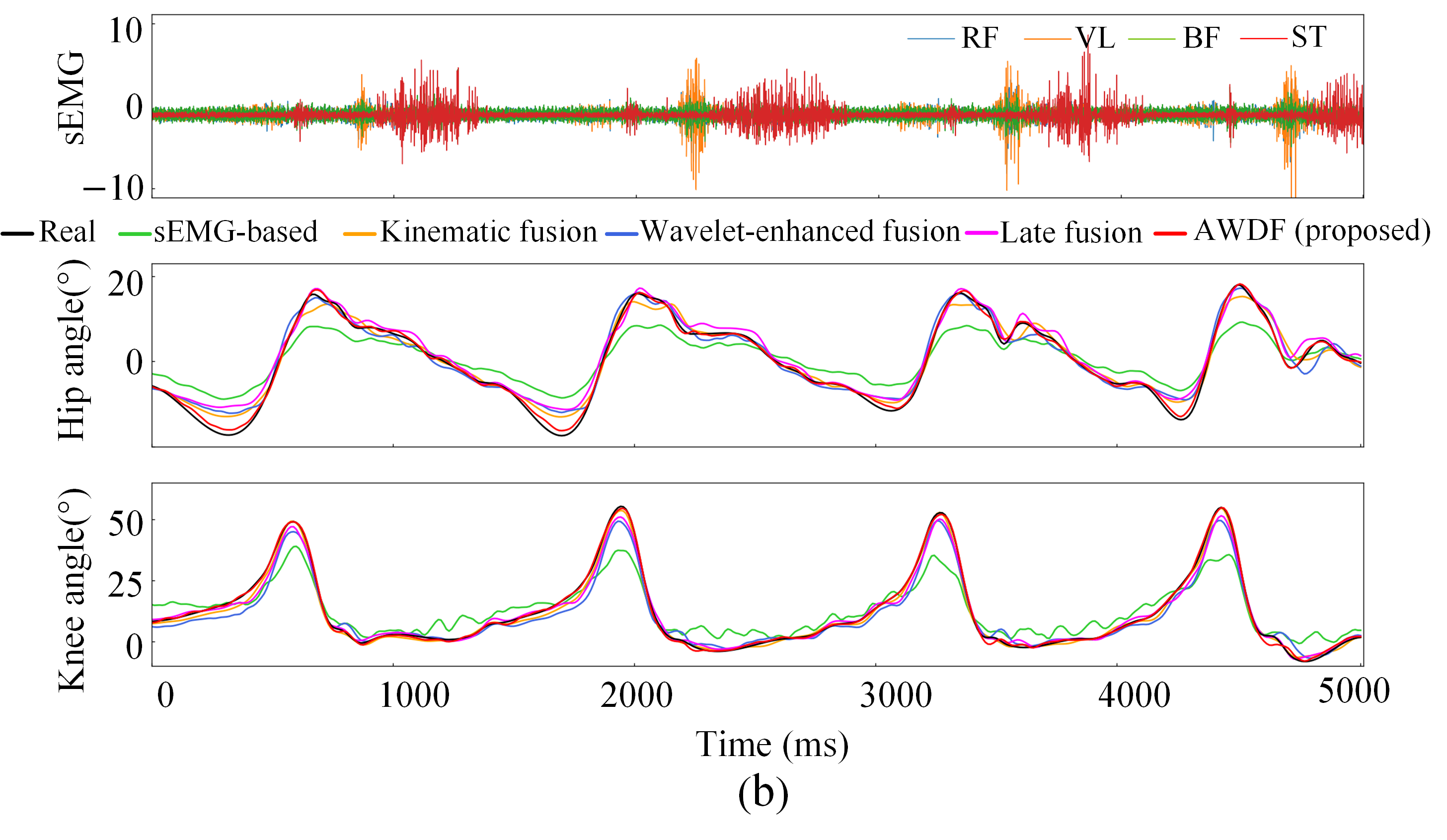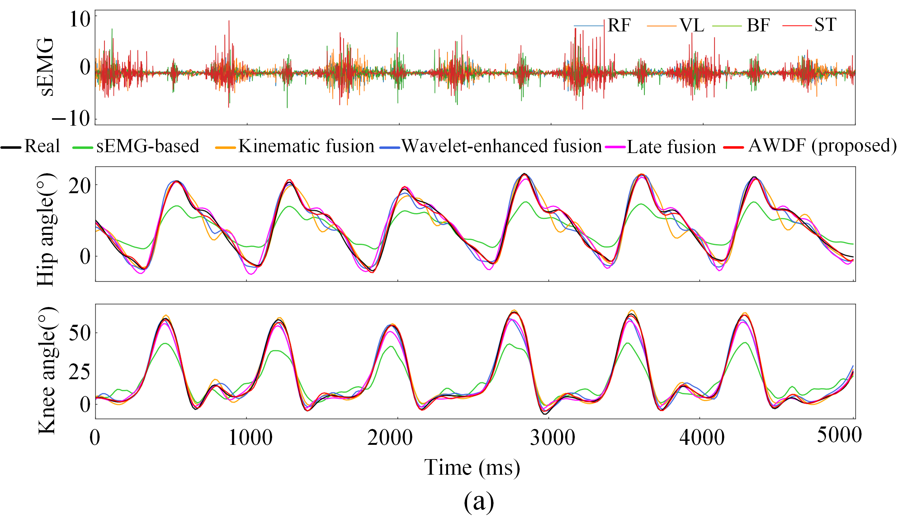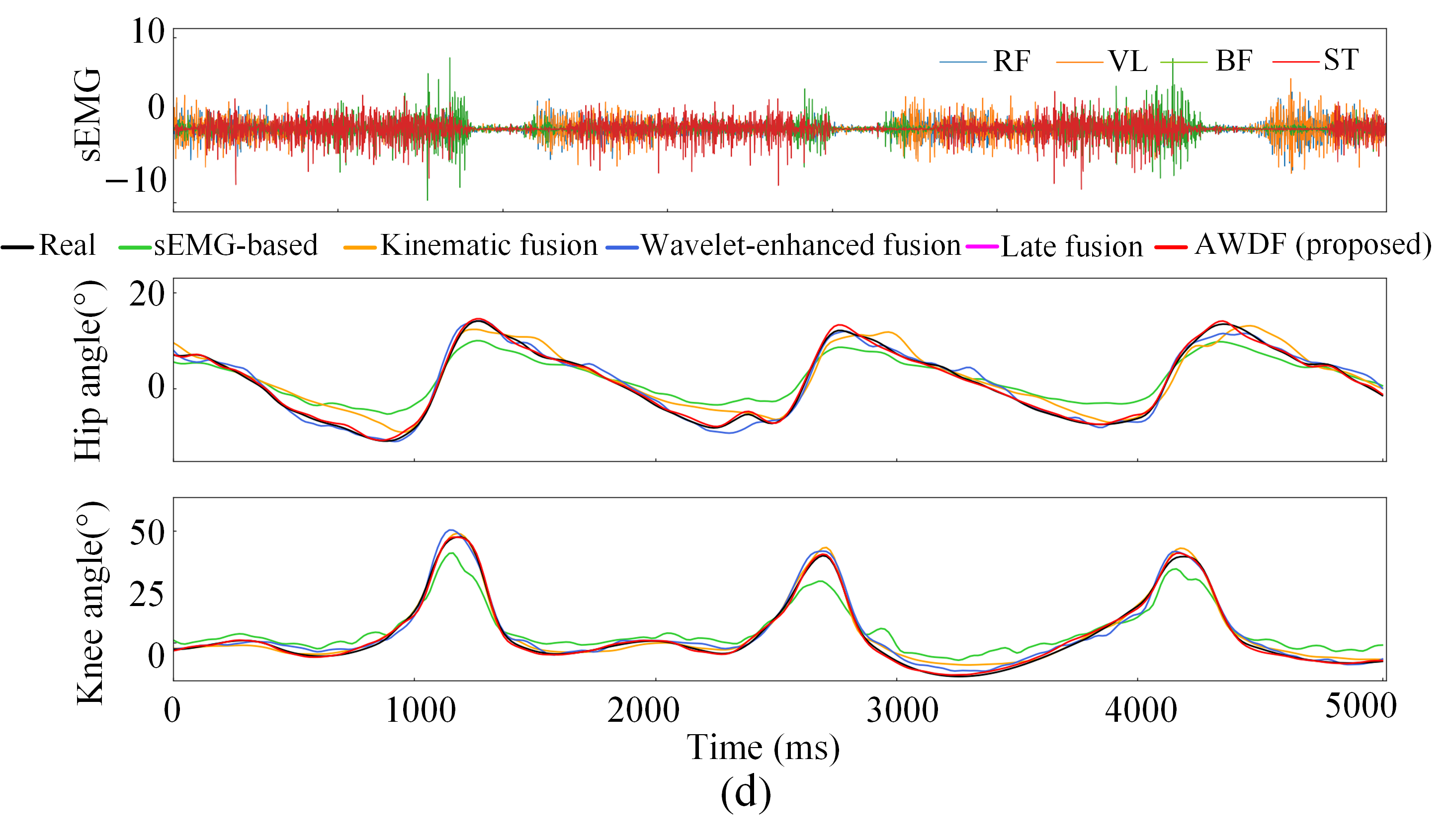 The proposed AWDF model addresses critical challenges in predicting lower-limb joint angles during BWST, where neuromuscular activation patterns exhibit non-stationary characteristics under varying BWSLs. Traditional Fourier-based methods inadequately resolve the time–frequency tradeoff for dynamic sEMG signals, while fixed-threshold wavelet denoising often discards motion-relevant high-frequency components.