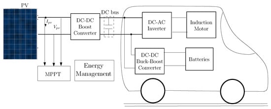 Figure 1 illustrates a simplified diagram of an electric vehicle (EV) propulsion system, showing the critical components involved in converting electrical energy into mechanical motion to propel the vehicle. The propulsion system integrates several essential components. The transmission links the induction motor (IM) to the vehicle’s wheels, often incorporating a gearbox to modulate the motor’s output speed and torque according to driving demands. The IM serves as the primary actuator, transforming electrical energy into mechanical energy for vehicle propulsion. To power the motor, the inverter converts direct current (DC) from the battery or photovoltaic (PV) system to alternating current (AC) that is compatible with the motor’s operation. The optional photovoltaic system supplements energy from solar sources, enhancing the overall efficiency and sustainability of the system.