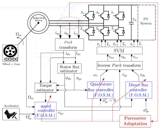The control system is centered on a robust control mechanism, integrating sophisticated algorithms and logic (see Figure 2). The fractional-order sliding mode (FO-SM) control technique is implemented to optimize the motor’s dynamic performance. Inputs from the driver, such as the position of the accelerator pedal, and from sensors, such as speed measurements, are processed by the control system to determine the desired motor torque and speed. The control signals are then sent to the inverter, which adjusts the AC voltage and frequency supplied to the induction motor. The motor generates the required torque, transmitted through the transmission to drive the wheels. In addition, the photovoltaic system, when included, can supplement the power of the system, further improving energy utilization and reducing the dependence on the battery.