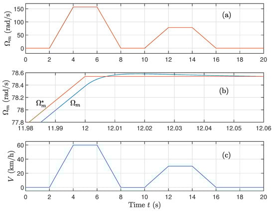 (a) Rotating speed, (b) Zoom of rotating speed, and (c) velocity of the vehicle for variations on rotor and stator resistances and variations on the magnetizing inductance using the sat function on the control and updated parameters.