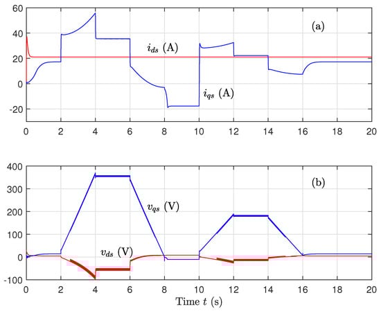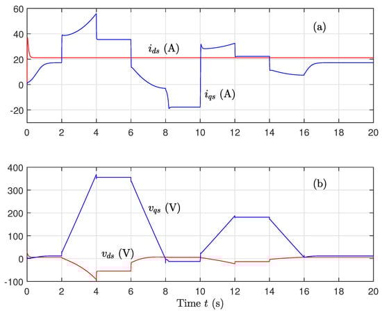 If represents the number of pole pairs, we have . Equations (1)–(3) yield to a fifth-order system with three controls (, , ). The idea is to decompose this system into three interconnected subsystems. With a suitable change of control variables, these subsystems become independent. Ideal decoupling can be achieved by aligning the rotor flux vector to the d-axis and setting the rotor flux linkage to be constant (, ).