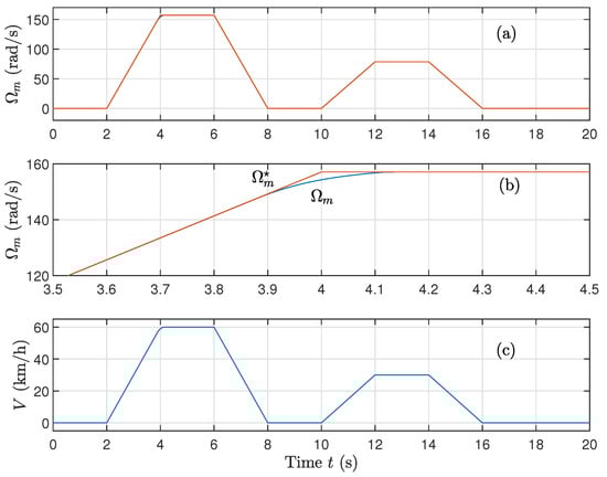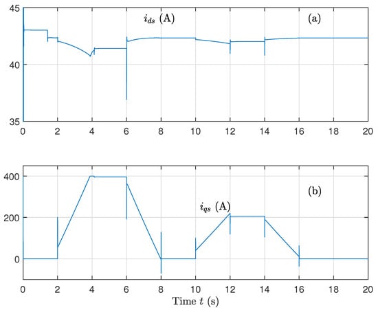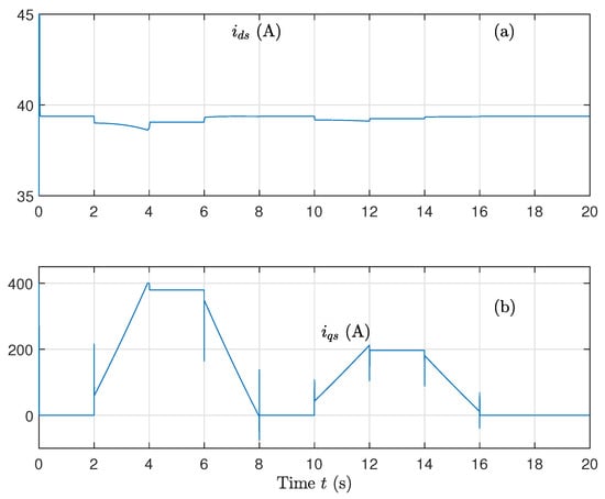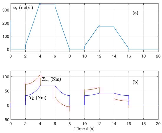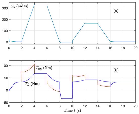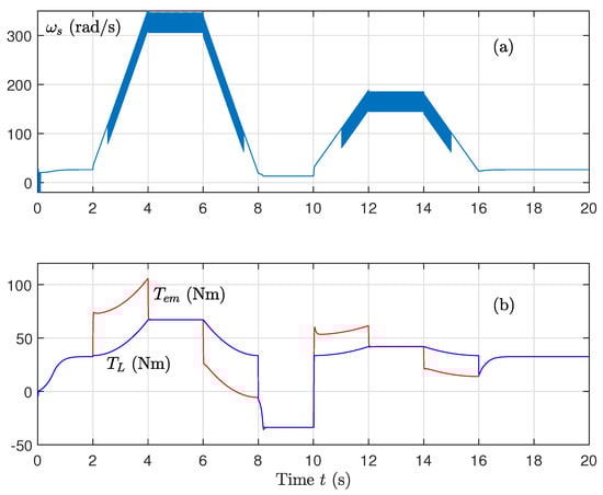 - Control of the machine speed is calculated as follows:withThe error quantities , , and are expressed as follows:with . These quantities go to zero after converging to zero and to .