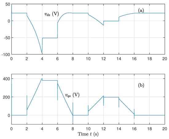 - Control of the quadrature flux—for , , we obtain the following:which should have goes to zero for an adequate control law of within a fast transient.