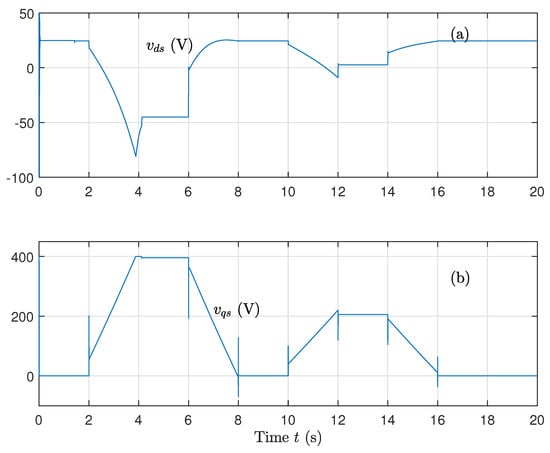 (a) Direct voltage component and (b) Quadrature voltage component, for variations on rotor and stator resistances and variations on the magnetizing inductance using the sat function on the control and updated parameters.
