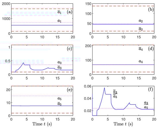 Regarding Figure 20, it is clear that the variations of parameters , , and are not important. In fact, the variations of these parameters perturb the second derivatives . However, these variations are compensated by the control law that contains the term (multiplied by or ). However, only the parameter has been updated. In fact, the defluxation problem is originated by the first derivative . This results from the equation , which contains , containing parameters and . If these parameters are perturbed, the convergence of to 0 leads to the convergence of to a value different from the derived . Regarding Figure 20f, we can conclude that the ratio between the updated values of and converge to their desired ratio. This can be explained by the fact that if these parameters converge to and , k is a positive constant, and Equation (42) becomes the following: