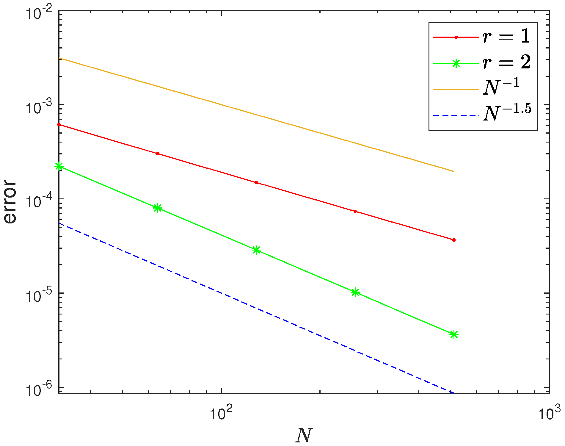 as local errors. As the spatial accuracy is well-known, here we just show the convergence in the time direction. To test the temporal accuracy, we take