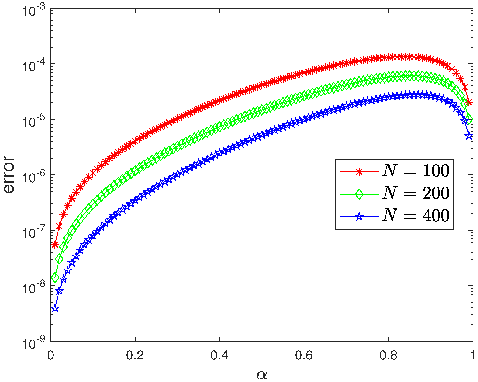 has an exact solution, written as follows:which exhibits a typical weak singularity at the initial time. The function f can be computed by (8)