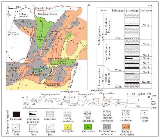 Structural outline (a), stratigraphic section (b) and stratigraphic column (c) of the Wugou Coal Mine (Revised from Jiang et al., 2010) []. Reproduced with permission from Bo Jiang, Zhenghui Qu, Geoff G.X. Wang, Ming Li, International Journal of Coal Geology; published by Elsevier, 2010.