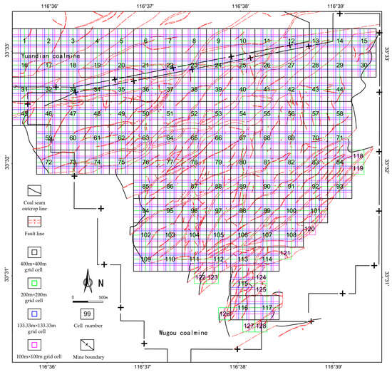 For the practical calculation of the fractal capacity dimension, the scale effect must be considered: larger grid sizes provide broader spatial coverage but reduced representativeness, while excessively small grid sizes result in fewer faults per unit and a consequently lower fractal dimension. The calculation in this study was based on fault-coal intersection lines and fault traces from the contour map of the No. 10 coal seam floor in the Wugou Coal Mine. Given that the general minimum fault spacing in the mining area is 100 m, a 100 m × 100 m grid was selected as the smallest analytical unit. Structural assessment was conducted using 400 m × 400 m grid cells, totaling 128 evaluation units (Figure 2). The study area was progressively divided into a four-level grid system with cell sizes of 400 m × 400 m, 200 m × 200 m, 133.33 m × 133.33 m, and 100 m × 100 m. This hierarchical division allowed the representation of fractal characteristics down to the smallest analytical unit. Finally, the number of grids containing fault traces within each unit was counted.