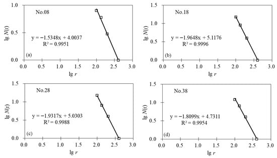 Self-similarity phenomena are common in geological structures, where micro-fractures, joints, and faults exhibit statistical self-similarity in their geometric, kinematic, and dynamic characteristics. This reflects the application of fractal theory in structural studies and establishes it as a key method for quantitatively evaluating mining-induced structural complexity. Many researchers have employed fractal theory to analyze faults, including their geometric characteristics, strength, frictional forces, fracture energy, and paleostress fields [,,,,,]. Additionally, some scholars have utilized fractals to assess fault complexity and water productivity []. Integrating pores and fractures, fractal theory has also been applied in reservoir evaluation. Zhang et al. established a coalbed methane seepage model based on the fractal characteristics of fracture-pore structures []. Liu et al. investigated the pore structure and fractal characteristics of the Nenjiang shale in the Songliao Basin, northeastern China [].