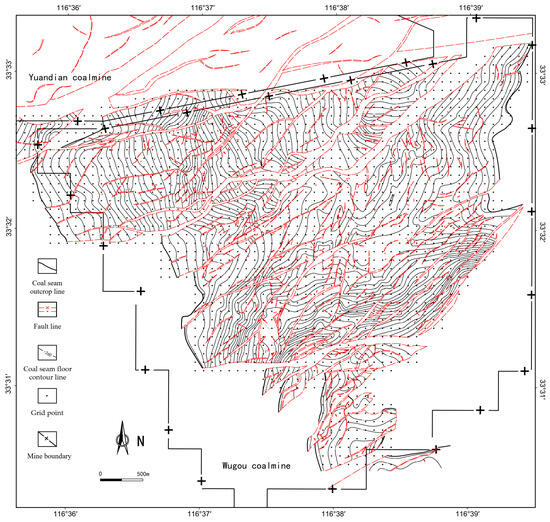 Based on the contour map of the No. 10 coal seam floor in the Wugou Coal Mine, a grid with a cell size of 100 m × 100 m was constructed (Figure 4). Using the (x, y, z) coordinates of 1660 grid nodes, the values were substituted into Formulas (3)–(10) to calculate the mean curvature, Gaussian curvature, minimum curvature, and maximum curvature of the No. 10 coal seam. Corresponding curvature contour maps were generated.