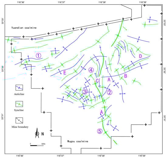 Planar distribution, assemblage, and combination patterns of folds in the Wugou Coal Mine. ① Parallel folds, ② Branch-like folds, ③ En echelon folds, ④ Brush-like folds, ⑤ Arc-shaped folds; (A) Oblique-crossing type, (B) Crossing type, (C) Deflection type, (D) Oblique-limiting type, (E) Enhancement type.