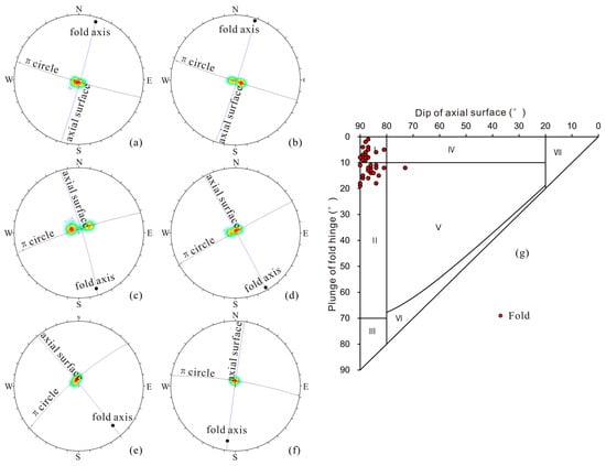 Stereographic projection analysis of folds (a–f) and statistical classification of fold attitudes (g). I, Upright horizontal folds; II, Upright plunging folds; III, Inclined vertical folds; IV, Inclined horizontal folds; V, Inclined plunging folds; VI, Reclining folds; VII, Recumbent folds.