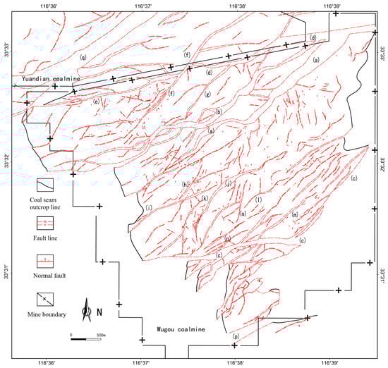 Fault distribution of the Wugou Coal Mine. (a) F14 fault; (b) F13 fault; (c) F9 fault; (d) Wugou fault; (e) F16 fault; (f) F2 fault; (g) F3 fault; (h) F4 fault; (i) F5 fault; (j) F6 fault; (k) F7 fault; (l) F8 fault; (m) F10 fault; (n) DF68 fault; (o) DF65 fault; (p) Lijia fault; (q) Yangliu fault.