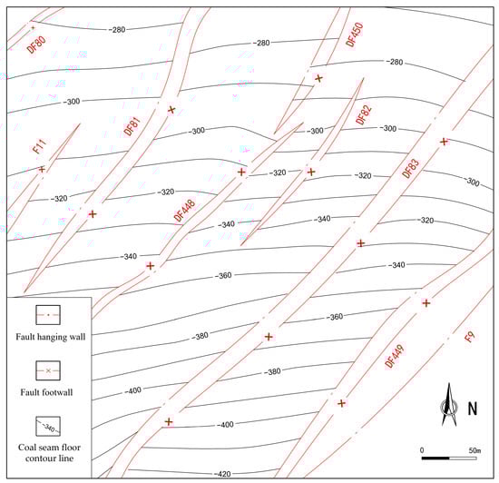 The fault structures in the Wugou Coal Mine are exceptionally well-developed, dominated by normal faults which account for approximately 90% of the total, with a small number of reverse and strike-slip faults. A total of 569 faults are developed in the No. 10 coal seam, among which 336 are small faults with a throw of 0–5 m, accounting for 59%, and 11 are large faults with a throw greater than 50 m. The fault strikes are primarily NE-oriented, followed by NEE and NNE directions, while the fault dips are mainly toward the NW, with a secondary preference for NNW, collectively exhibiting a step-like pattern (Figure 7).