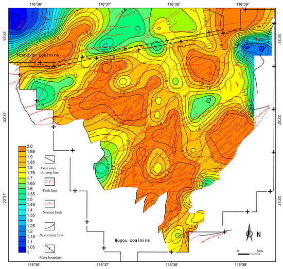 Fractal dimension of faults effectively characterizes the complexity of fault development. In the Wugou Coal Mine, the capacity dimension (Dk) of faults within the 400 m × 400 m evaluation units ranges from 1.0 to 2.0, with an average value of 1.80, significantly higher than the average fractal dimension of 1.52 for the entire Huaibei Coalfield. This discrepancy aligns with the extensively developed fault systems observed in the mine. The planar distribution of Dk values exhibits notable variability and distinct zoning, generally falling between 1.8 and 2.0, reflecting highly complex fault structures throughout the mining area. Based on Dk values, the region can be categorized into four distinct zones: An Extremely Complex Fault Zone (Dk = 1.9–2.0), a Complex Fault Zone (Dk = 1.8–1.9), a Moderately Developed Fault Zone (Dk = 1.4–1.8), and a Simply Developed Fault Zone (Dk = 0–1.4) (Figure 9).