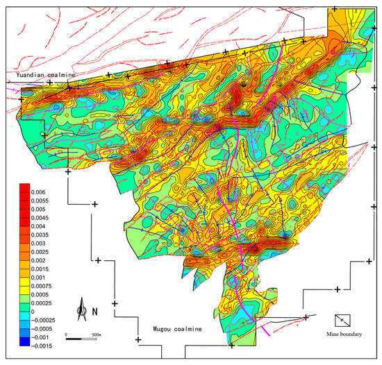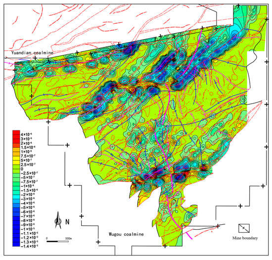 The mean curvature (Kmean) of the No. 10 coal seam in the Wugou Coal Mine ranges from −2.78 × 10−3 to 2.44 × 10−3, with an average of −1.30 × 10−5. The distribution of mean curvature exhibits a more complex pattern, characterized by alternating positive and negative value zones (Figure 12). It shows a particularly significant response to the development of very large and large normal faults: the zero-value line of mean curvature aligns with the distribution of fault lines, while the hanging walls and footwalls of faults correspond to negative low-value zones and positive high-value zones of mean curvature, respectively. Six anomaly bands are formed along the northern F16 fault, central F13 and F14 faults, and southern F9 fault, where extremely high and extremely low mean curvature zones develop adjacent to each other and extend in parallel.