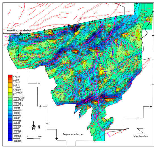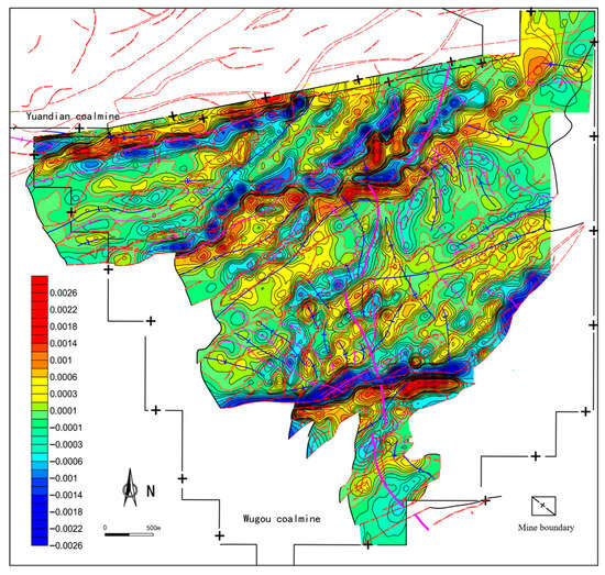 Areas with positive mean curvature generally correspond to the development of anticline structures. For example, the NE-trending Sunjia Anticline and NEE-trending Sunwafang Anticline exhibit slightly high-value zones (0.0001 ≤ Kmean < 0.0005). Negative value zones are associated with syncline structures, while the zero-value line of mean curvature effectively reflects the spatial extent of fold development. The absolute value of mean curvature indicates the degree of fold deformation. The mean curvature in the mining area typically ranges from −0.0003 to 0.0003, reflecting overall weak fold deformation in the region (Figure 12). Additionally, relatively high mean curvature zones often indicate the development of dome structures. For instance, the isolated relatively high-value zone of mean curvature (Kmean > 0.0012) in the central Wugou East Dome structure, and the isolated relatively low-value zone (Kmean < −0.0006) in the Dalijia Basin structure formed by the superposition of the southern Dalijia Syncline and Wugou Syncline.
