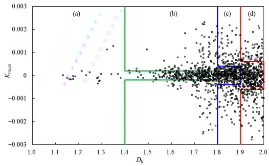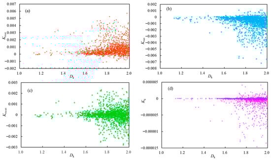 Relationship between different types of curvatures and fractal dimensions in the Wugou Coal Mine. (a) Maximum curvature; (b) Minimum curvature; (c) Mean curvature; (d) Gaussian curvature.