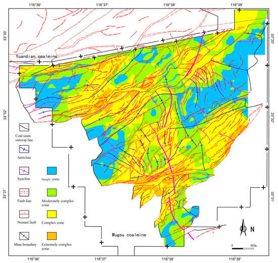 Notably, the areal extent of both extremely complex and complex structural zones is significantly reduced. The extremely complex zones are predominantly located along the peripheries of major faults F9, F13, F14, and F16, where secondary faults and folds intensively develop. Complex structural zones occur in areas with dense distributions of large-scale faults and their associated secondary structures, as well as in regions adjacent to major faults showing sparse secondary development. Approximately half of the study area falls under the complex structural category. Moderately complex zones correlate with sparsely distributed large faults and folds, accompanied by minor fault development. Three structurally simple zones are identified in the eastern, western, and northwestern parts of the study area, characterized by sparse small-scale faulting and minimal fold deformation.