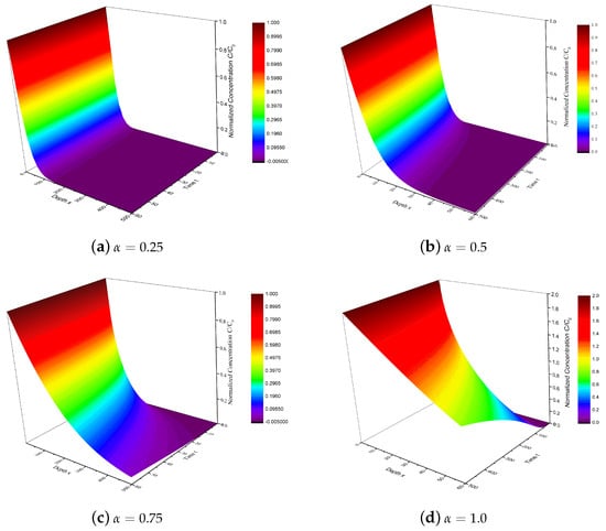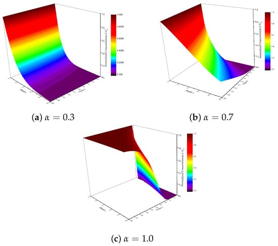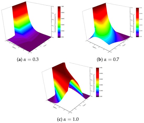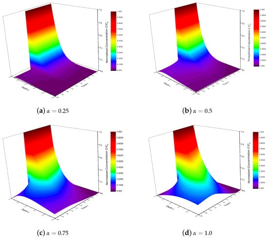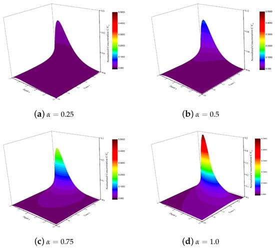 Figure 6 shows concentration distributions of AB-ADM with first-order decay in Equation (23) for different fractional index values.