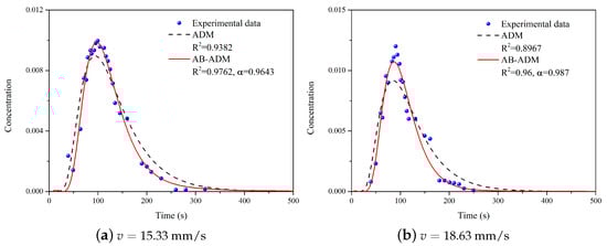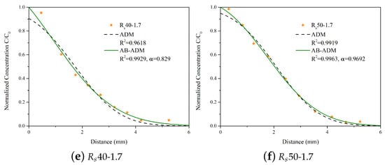 Figure 7 indicates that the fitting results of AB-ADM in Equation (25) with experimental data [49] for long-term tritium transport are better than the fitting results of ADM in Equation (26). The numerical simulations of the AB-ADM in Equation (25) are displayed in Figure 8.