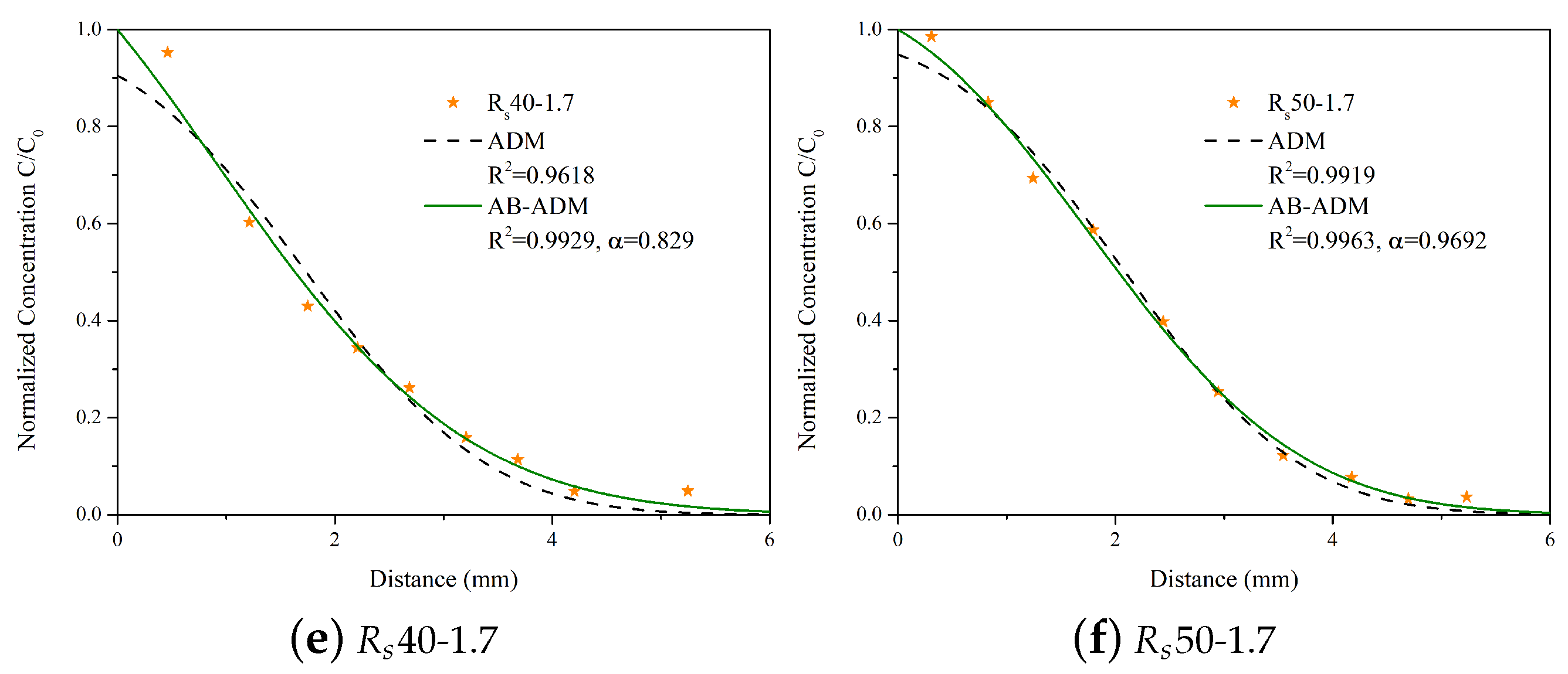 3.2. AB-ADM with Linear Adsorption for Constant Concentration Source
