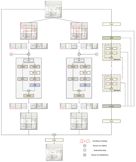 At the Backbone stage, the network is embedded with the CrossGrid Memory Block (CGMB). This module unfolds the input feature map into one-dimensional sequences along orthogonal directions and employs the Mamba state-space model to achieve long-range dependency modeling, while concurrently retaining a local convolutional path to extract fine-grained textures. The Orthogonal Grid Memory Modeling (OGMM) mechanism can capture complementary pixel relationships in both horizontal and vertical directions and explicitly incorporates spatial information through a position enhancement layer, thereby maintaining semantic consistency and strong spatial awareness at both local and global levels.