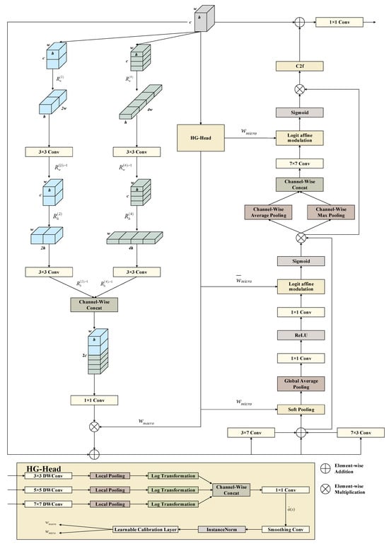 Indoor object detection often encounters challenges such as large-scale variations, densely distributed targets, frequent occlusions, and irregular texture and boundary distributions. This requires the detector, at the feature fusion stage, to not only maintain the consistency of global structural information but also emphasize fine-grained features critical for recognizing small objects. Conventional feature pyramid structures can provide cross-scale alignment, but they lack a dynamic balancing mechanism between global and local contexts. To address this, we propose the Hölder-Based Regularity Guidance–Hierarchical Context Aggregation Block (HG-HCA), which introduces a local regularity map to adaptively modulate the contributions of macro- and micro-context pathways, thereby achieving a self-adjusting balance between global structural modeling and local discriminative enhancement. The overall architecture is illustrated in Figure 3.