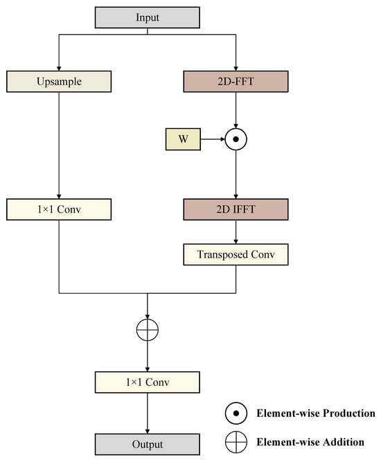 Schematic of the Frequency-Guided Residual Block. The module comprises two branches: a spatial up-sampling path and a frequency-domain compensation path. The former preserves structural information through interpolation and convolution, while the latter recovers high-frequency details through frequency weight enhancement and transposed convolution. The outputs of the two are fused in the residual domain and then refined by a convolution, generating a high-resolution feature map that incorporates both global structure and detailed textures.