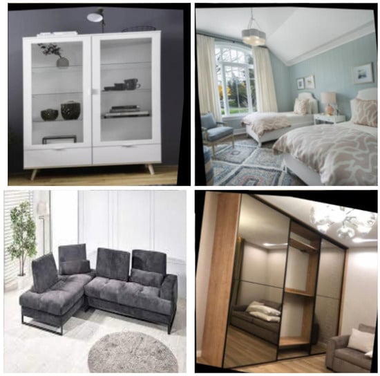 This study utilized the Furniture Detection v20 [] dataset as the core data foundation for the experiments. During the preprocessing stage, the original data underwent automatic rotation correction and size normalization. Data augmentation techniques, including rotation and cropping, were also applied to enhance the diversity and robustness of the samples. However, the original dataset exhibited certain deficiencies in class distribution and annotation format; some classes were sparsely populated, and some mask annotations were unsuitable for the detection task. To address these issues, this study systematically reprocessed the dataset. This included merging semantic categories, converting masks to bounding boxes, and unifying label formats, thereby constructing a high-quality version more suitable for the object detection task. Sample images from the dataset are shown in Figure 5.