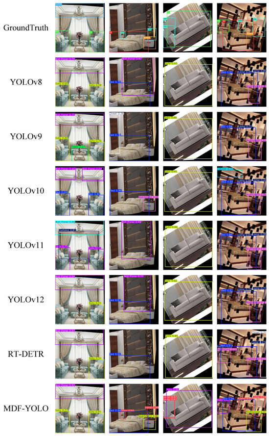 Experimental results show that MDF-YOLO achieves superior performance compared to existing mainstream detectors on mAP@0.5, mAP@0.75, and the comprehensive metric mAP@0.5:0.95. This performance validates the effectiveness of CGMB in modeling long-range dependencies while preserving 2D topological structure, the success of HG-HCA in adaptively fusing macro and micro contexts under the guidance of Hölder regularity priors, and the capability of FGRB to compensate for fine-grained structural details during high-frequency information recovery. It is noteworthy that the model’s results on FPS and Latency metrics indicate that its overall detection efficiency did not significantly decrease due to structural improvements. This suggests that the proposed method achieves stronger adaptability to complex indoor environments while maintaining a low computational cost.