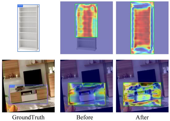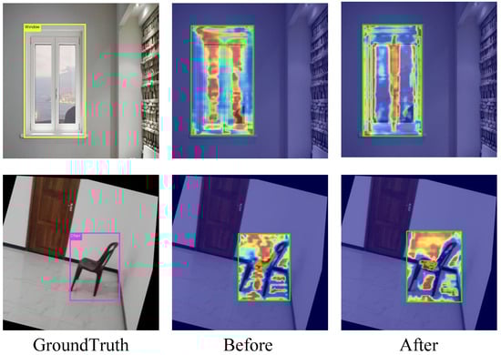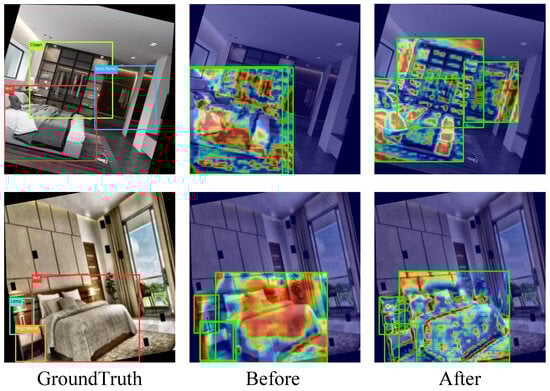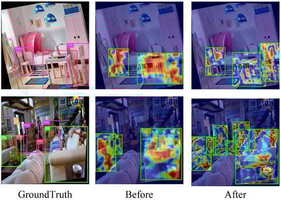 To intuitively reveal the operational mechanisms of each module at the feature level, we conducted a further visual analysis of the model’s attention distribution via heatmaps before and after module integration. The heatmap comparison in Figure 7 clearly illustrates the role of the CGM Block in enhancing global structural perception. Before its introduction, the baseline model’s response to large-sized objects was relatively scattered, with activation areas appearing fragmented. After its introduction, thanks to the CGM Block’s capture of long-range spatial dependencies via its orthogonal grid memory modeling mechanism, previously discontinuous activation areas on the target were effectively integrated, forming a continuous and uniform high-response region that covers the object’s complete contour. This visually corroborates the ability of CGMB to improve global consistency and localization stability.