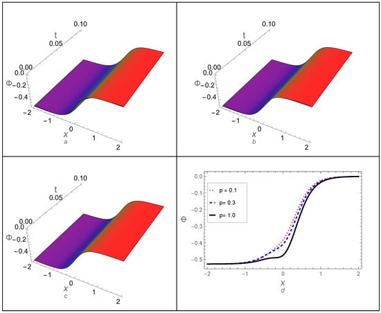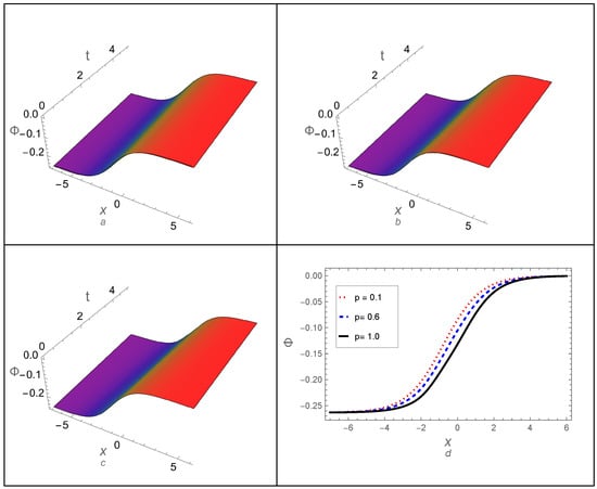 The DA shock wave approximation (35) using LRPSM is examined against the fractional-order parameter p: (a) is plotted in -plane at , (b) is plotted in -plane at , (c) is plotted in -plane at , and (d) is plotted against various values of p.