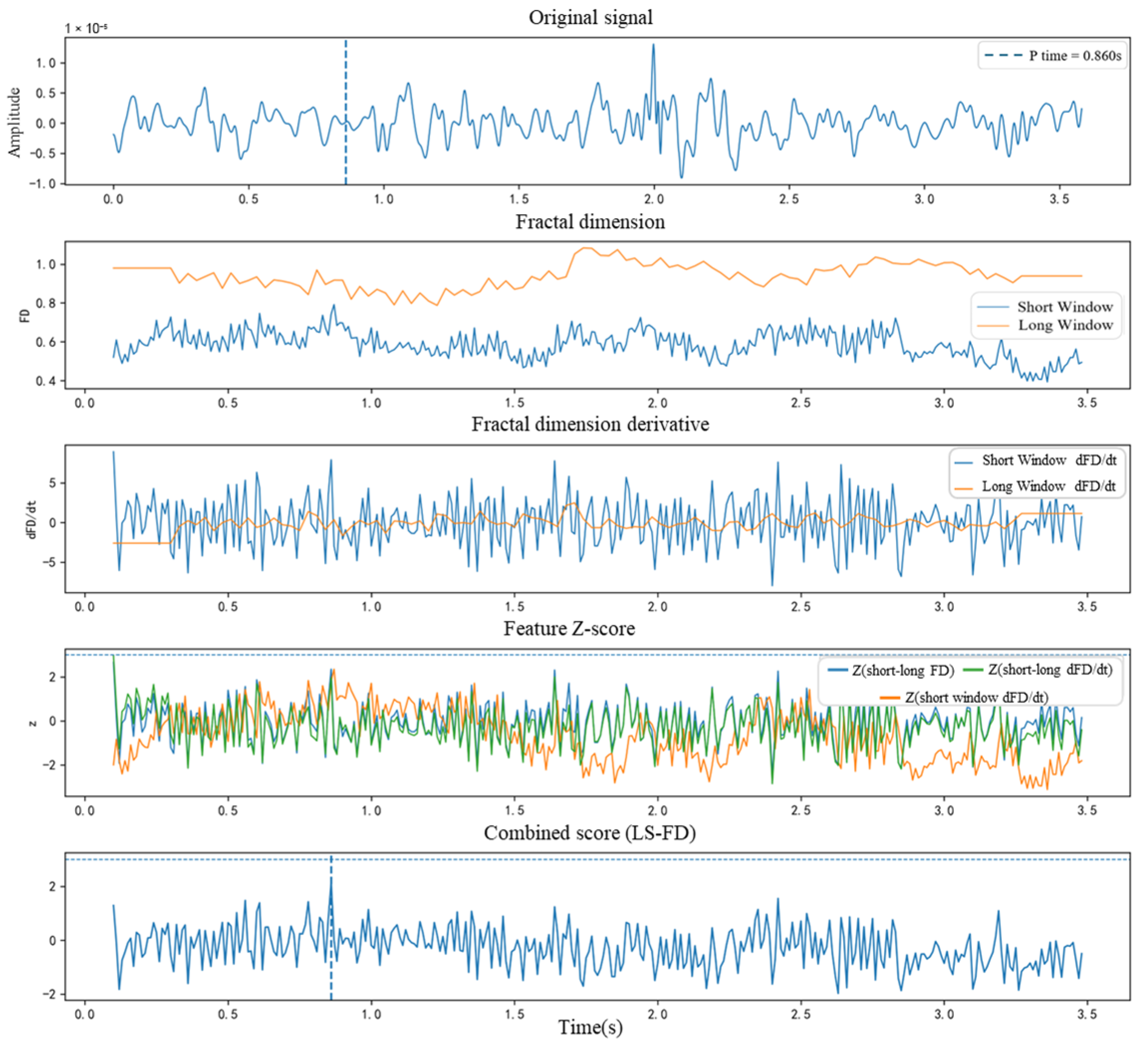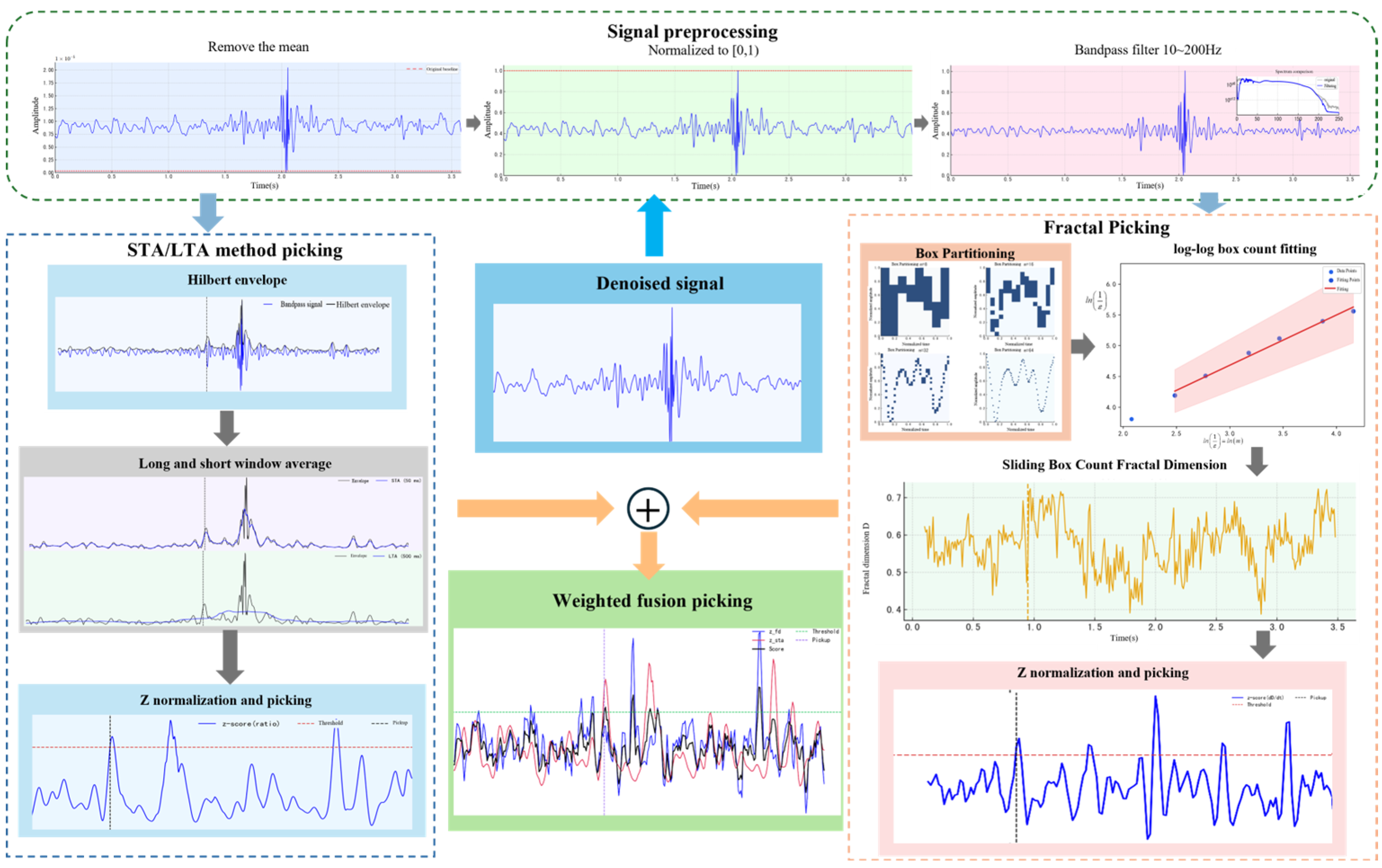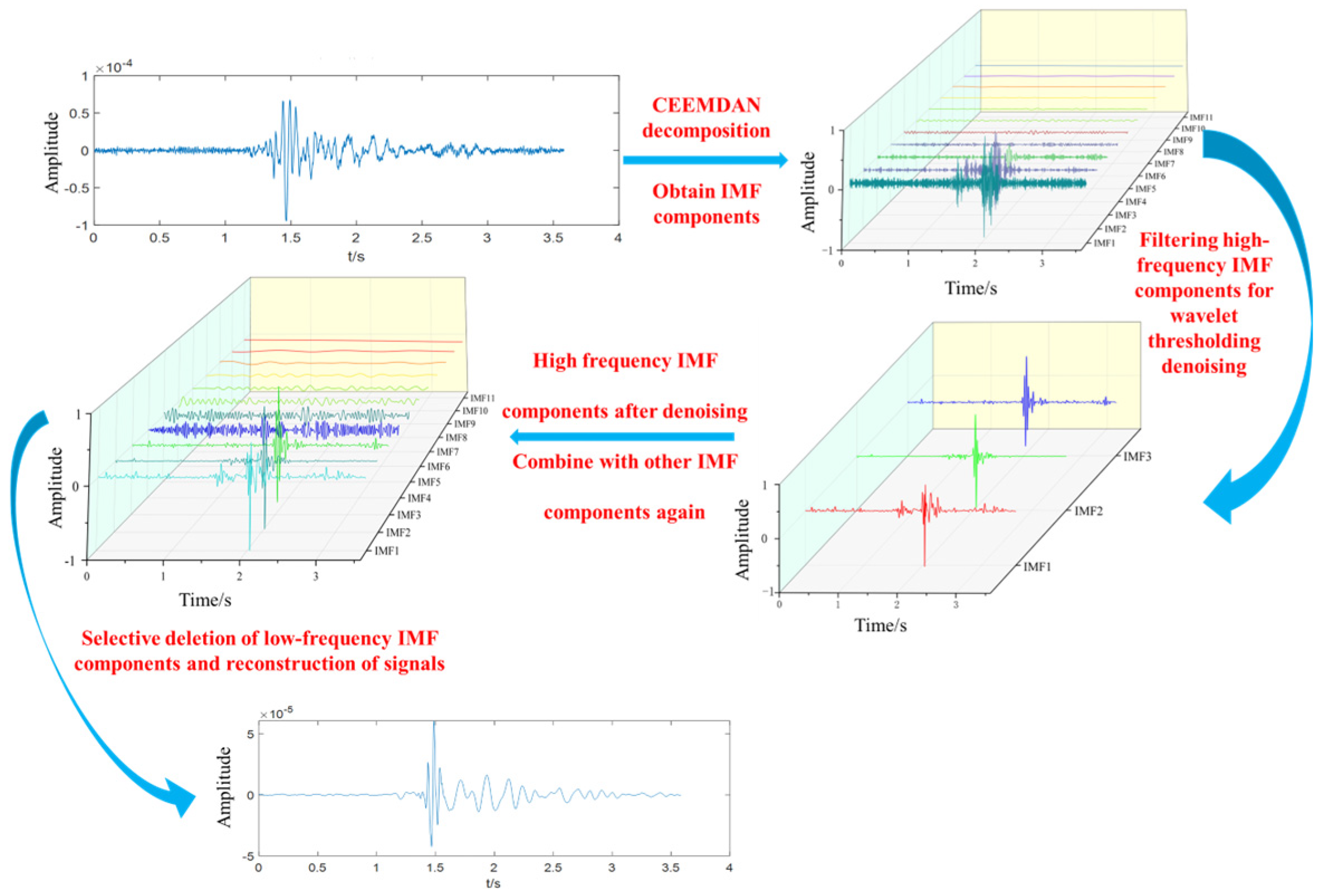 In microseismic signal processing, the advantages of CEEMDAN are particularly prominent. On one hand, it can separate high-frequency random noise into independent IMF components, which facilitates subsequent denoising; on the other hand, it effectively preserves the true structure of mid- and low-frequency signals, making the first-arrival features of seismic events clearer. In this study, a noise suppression module is constructed based on CEEMDAN, and the IMF components are further optimized using wavelet threshold denoising so as to obtain input signals with a high signal-to-noise ratio under complex noise conditions, laying a foundation for the subsequent fusion picking method based on fractal box dimension and STA/LTA.