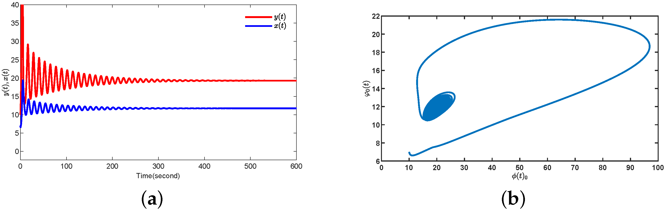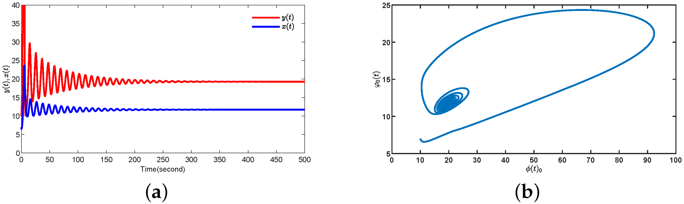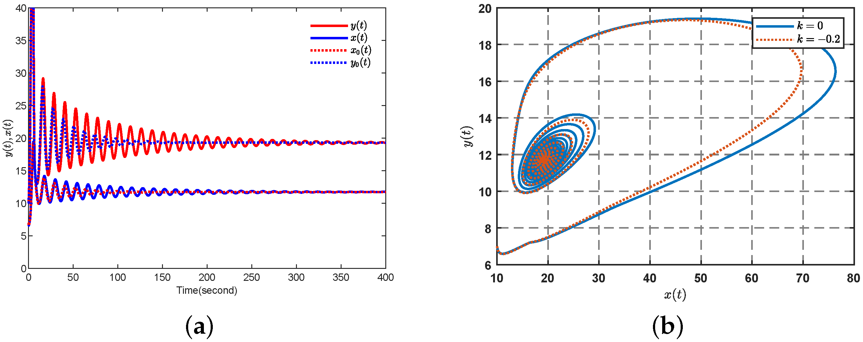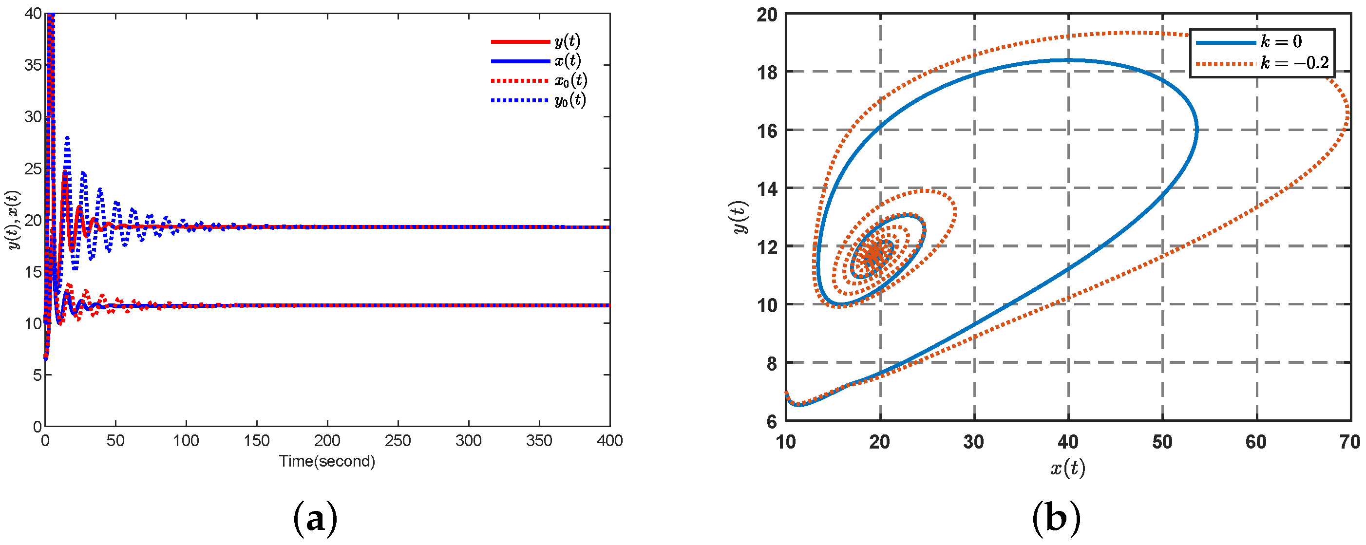 40) converges to the equilibrium point faster, which means that the delay parameter has less influence on the system. At the same time, from