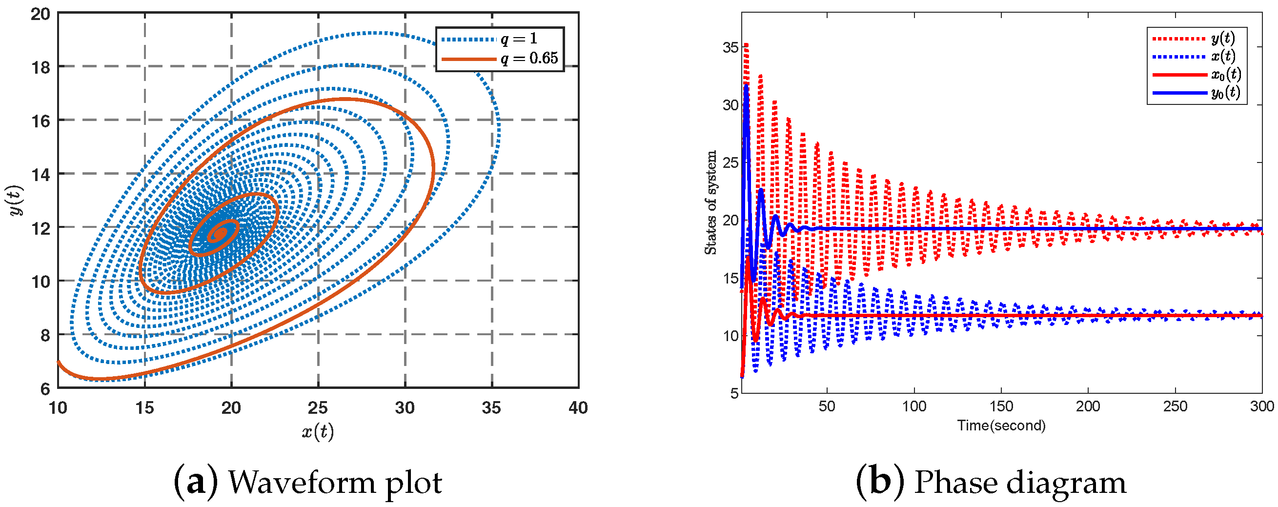 Figure 5 shows the phase diagram and wave diagram of the integer-order and fractional-order systems when the time delay is 0,