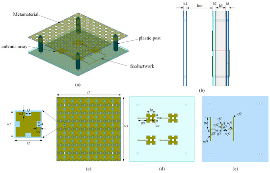 Figure 1a shows the overall structure of the array antenna, while Figure 1b shows its side view. Figure 1c–e shows the front views of the 8 × 8 metasurface array structure, 2 × 2 array antenna, and feed network of the array antenna, respectively.