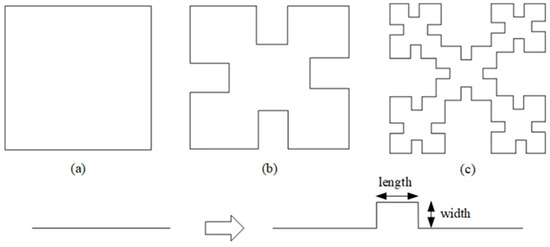 Fractal structures exhibit self-similarity and can be used to miniaturize the antenna structure. In this study, the antenna unit was designed with a first-order Minkowski fractal structure, as shown in the figure, while Figure 2a–c shows 0-order, 1-order, and 2-order structures, respectively.
