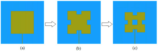 To clearly describe the unit structure of the proposed antenna, the design process of the antenna unit is shown in Figure 3a–c. Figure 3a–c shows a conventional rectangular microstrip patch antenna (Antenna 1), first-order Minkowski fractal antenna structure unit (Antenna 2), and first-order Minkowski fractal with square slot antenna unit structure (Antenna 3), respectively.