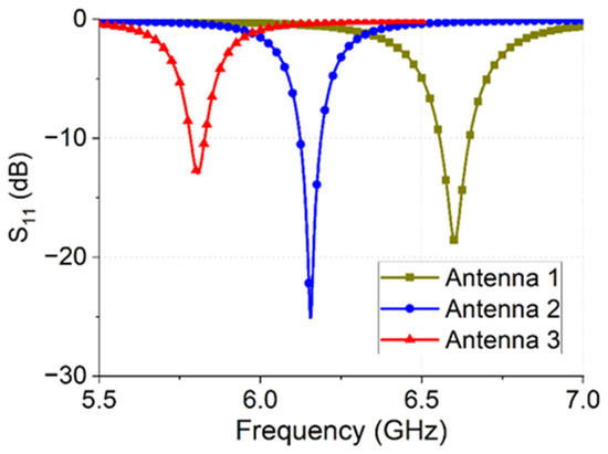 High Frequency Structure Simulator (HFSS) 15.0 was used in this study, and the simulation results of Antennas 1, 2, and 3 are shown in Figure 4. These results indicate that the resonant frequencies of Antennas 1, 2, and 3 are 5.8 GHz, 6.2 GHz, and 6.6 GHz, respectively. A comparison of Antennas 1 and 2 shows that under the same size conditions, Antenna 2 possesses a lower resonant frequency. It is verified that the fractal structure miniaturizes the antenna. A comparison of the antennas in Figure 3b,c shows that the square slot structure reduces the resonant frequency of the antenna, further miniaturizing it.