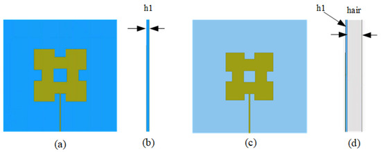 Structure of the antenna unit. (a) Front view of the comparison antenna, (b) side view of the comparison antenna, (c) front view of the proposed antenna, (d) side view of the proposed antenna.