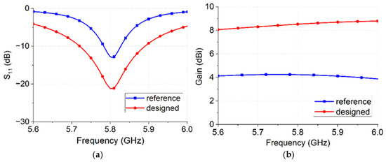 The simulation results of the reference and proposed antennas are shown in Figure 6. Figure 6a indicates that the proposed antenna has a wide working bandwidth compared to the reference antenna because it uses an air dielectric layer with a thickness of 2 mm. Figure 6b shows that, compared with the reference antenna, the proposed antenna has a higher gain. At the operating frequency of 5.8 GHz, the gain of the proposed antenna is 8.9 dBi, which is approximately 5 dB higher than that of the reference antenna.
