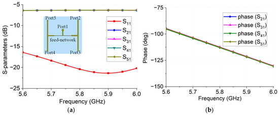 The structure of the 1–4 power divider designed in this work is shown in the figure. The electromagnetic simulation software HFSS was used and optimized. The simulation results are presented in Figure 7a, which shows that within the working frequency band 5.6–6.0 GHz, the insertion loss of the power divider is 0.2 dB. Further, Figure 7b shows that each output port has in-phase.